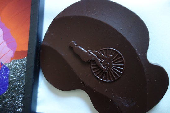 Czekolada jest tak naładowana kurkumą, że aż zabarwiła na żółto opakowanie! Widać też wyraźnie kurkumowe wtręty wewnątrz. Kompozycja pachnie wariacko: drewnem, masłem z kurkumą, środkiem do czyszczenia mebli i himalajską herbatą.